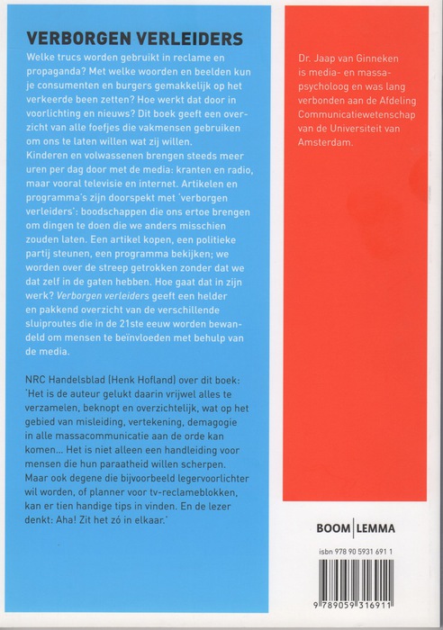Hidden persuaders – How you are influenced through the media. Dutch 2011 (3rd ed.), 2006, 2001, Verborgen verleiders – hoe de media je sturen (Den Haag: Boom Lemma, 167 p. w. cartoons by Sidney Harris, lit., register. ISBN 978 90 5931 691 1). An introduction to media psychology.